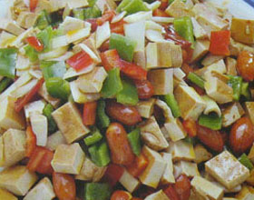腐丁红皮果:'1.将豆腐干洗净切成小丁,葱、青红海椒切成小段。2.锅内注油烧热,放入花生炒至皮红时捞出控油。3.将花生、腐丁、海椒、葱段加香油、白糖、盐、豆豉、...