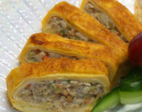 6.将蛋皮辅在案子上,撒上干淀粉,抹上蛋清糊,把肉馅均匀地铺在蛋皮上,由一端卷成卷。待用;