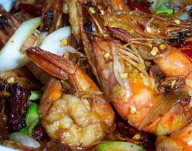 南洋奶油虾:'1.草虾洗净,剪去须脚;2.干红椒切去尾;3.锅上火下油烧至八成热时,放入草虾炸至干身,倒出沥干;4.锅下黄油,加咖喱粉,干红椒煸炒至香,放入椰浆,...