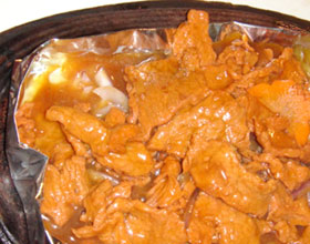 铁板黑椒牛柳:'1.将牛柳(牛里脊肉)去筋后切成长5 厘米、厚4 毫米的片,进行腌制;2.腌制入味的牛肉片加入食粉3克,生抽6克、味精5克、黄酒5克、清水75毫升、淀粉1...