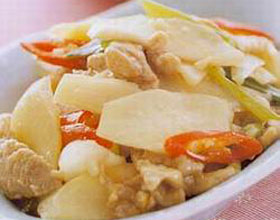 山药炒肉片:'1.山药洗净刮去皮,竖切两半切薄片,放沸水中焯出。2.里脊肉切薄片,放碗中加盐、蛋清、水淀粉上浆,放温油中划出。3.滑勺内加植物油烧热,放入葱丁煸...    详细介绍