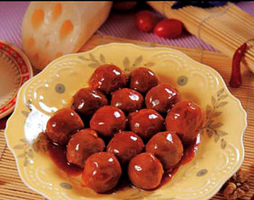 红烧丸子:'1.把肉洗净剁成细泥,加湿淀粉、蛋黄搅匀,用手挤成大小相等的丸子;2.把油菜、胡萝卜分别洗净均切成象眼片;3.葱、姜均切丝,蒜切片;4.勺内放油烧至...