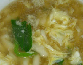 12.待沸起后将“猫耳朵”放入锅,煮至“耳朵”浮起,加入已煮熟的豌豆,加盐和味精,出锅分装碗内,淋上鸡油即成。