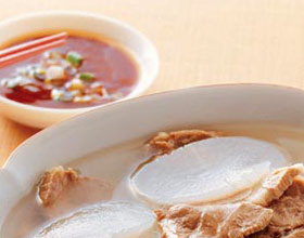 萝卜连锅汤:'1.将坐臀肉洗净下锅,加入高汤、姜葱(切末)、料酒5克,将肉煮成7成熟时捞起,切成7厘米长薄片;2.萝卜刨去皮,切成4厘米长、1.5毫米厚、4厘米宽的片...    详细介绍