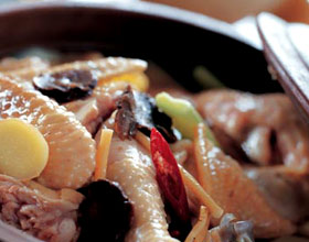 五味养生鸡:'1.将黄精、枸杞子、女贞子、何首乌、旱莲草洗净,切碎,装入纱布袋中,封口备用;2.将鸡宰杀,去毛去内脏;3.将鸡在沸水锅中焯去血水,漂净;4.葱切段...