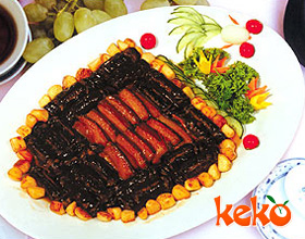 11.将肉片、鳝段一同下入带有竹箅的砂锅中,倒入肉汤和鳝鱼卤汁,加入白糖,盖上锅盖,置旺火上烧沸后再改用小火焖约15 分钟,再用旺火收浓汤汁;
