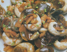香糟香螺:'1.将香螺放入清水中,加入少许食油,使其吐尽泥沙;猪五花肉切丁。2.炒锅注油烧热,下葱花、姜末爆香,再下香螺、猪肉丁翻炒,炒至螺口壳脱落时,加入...    详细介绍